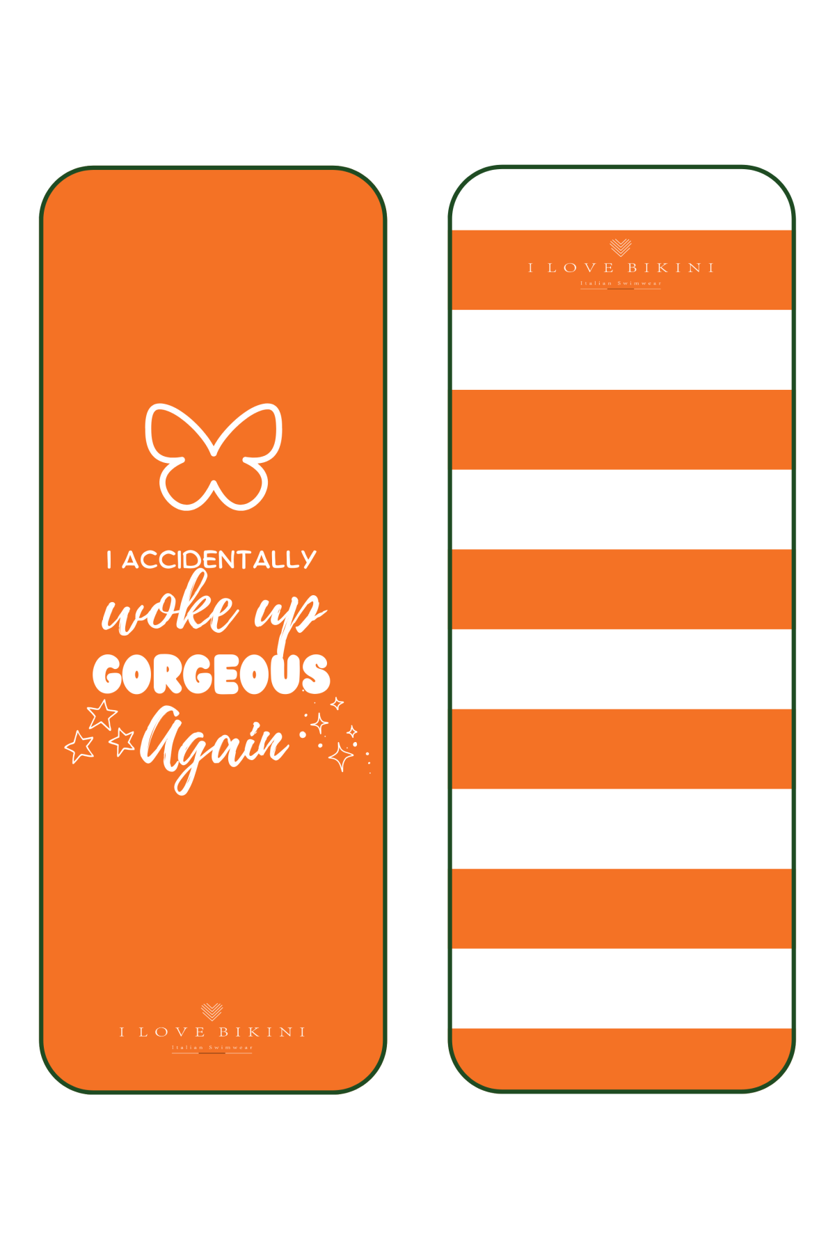 Strandtuch aus Mikrofaser mit der Aufschrift "I ACCIDENTALLY WAKE UP GORGEOUS AGAIN".
