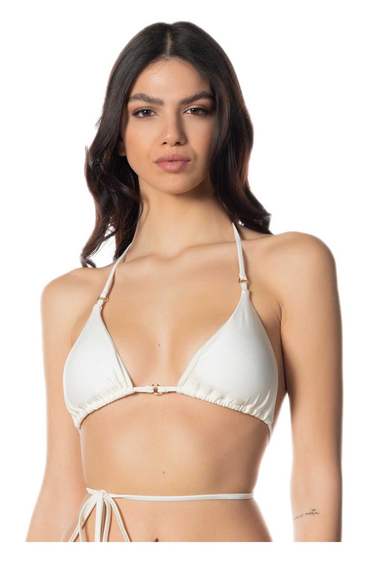 Triangle with long laces and gold accessories, features removable inner cups that provide light support for the breasts while maintaining their natural shape.