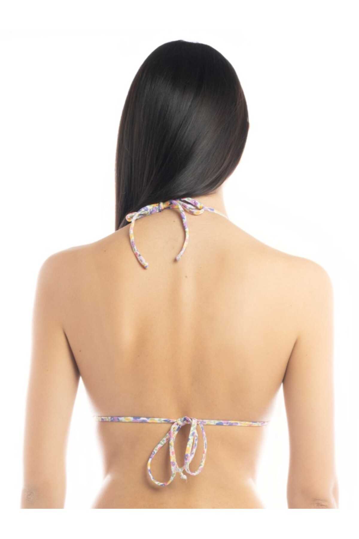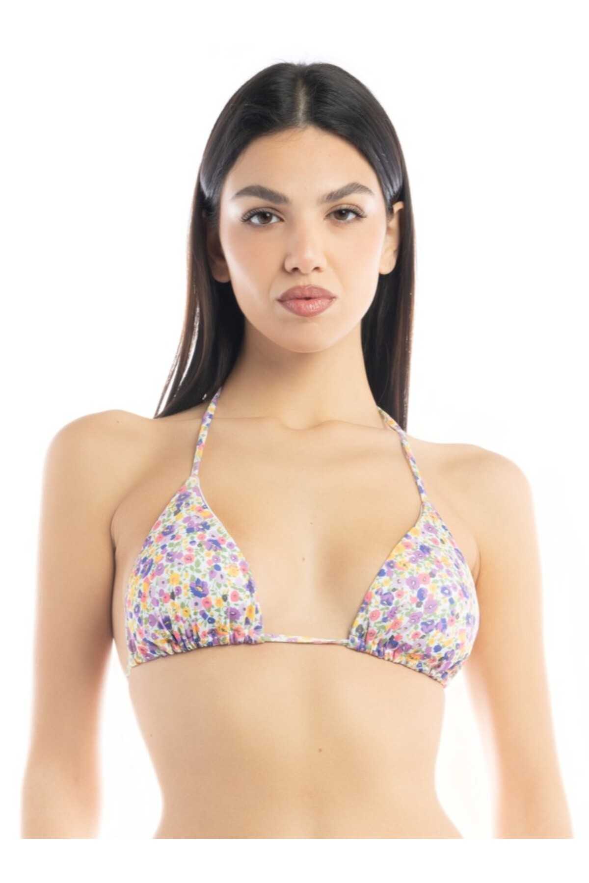 Triángulo básico de licra floral acolchado con copas extraíbles, que proporcionan una ligera sujeción a los senos manteniendo su forma natural.