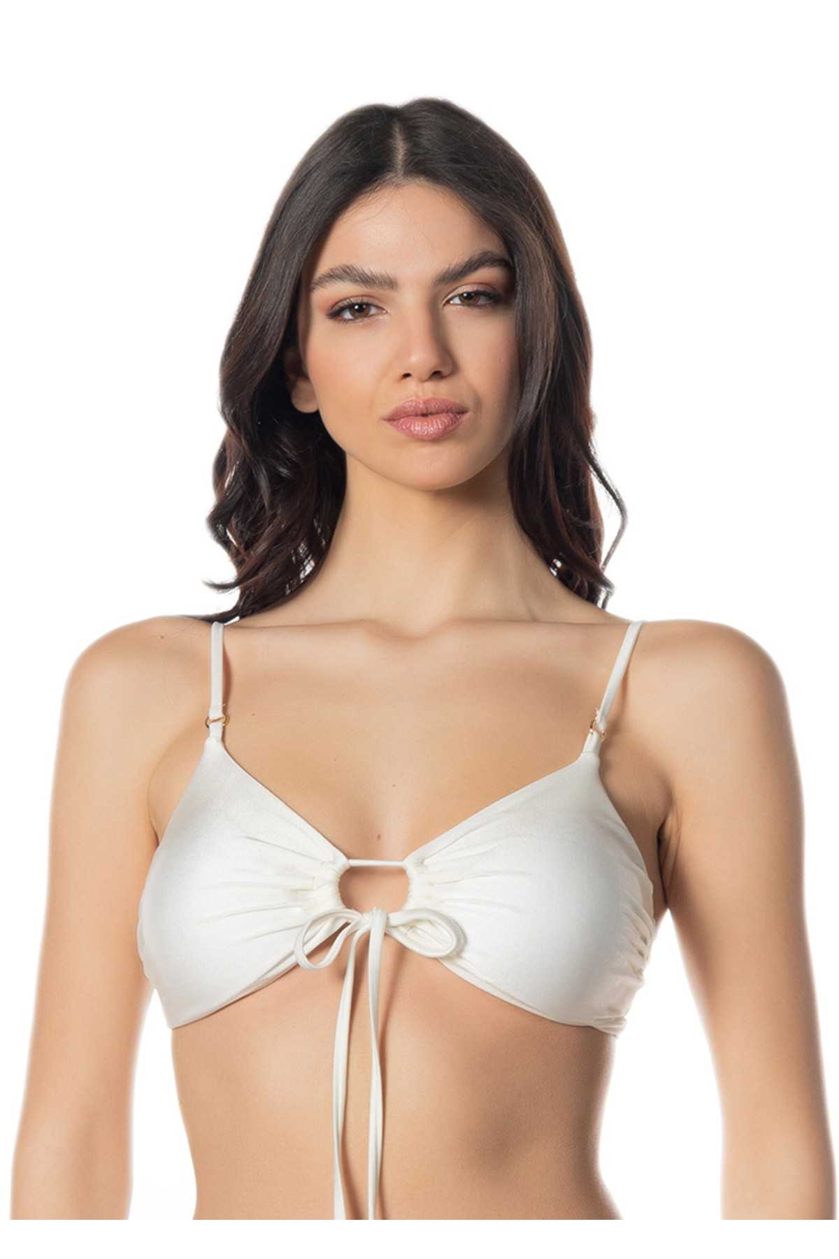 Brassière avec hublots et longs liens sur le devant, elle est dotée de bonnets intérieurs amovibles qui soutiennent légèrement la poitrine tout en conservant sa forme naturelle.